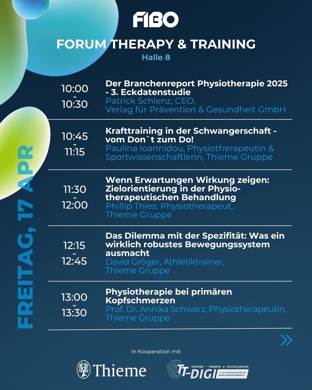 In diesem Jahr wird das Programm des Forums Therapie und Training (Halle 8) auf der FIBO 2026 am Freitag (17. April) in Kooperation mit unserem Verlag für Prävention & Gesundheit GmbH und dem Thieme Verlag veranstaltet.