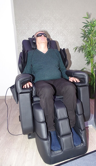 Diese Erfahrung machte Unternehmer und Physiotherapeut Baumann auch selbst. Er hatte schon mehrere Jahre das System im Blick, aber letztendlich gab eine Messe den Ausschlag, als er selbst sich in einen Entspannungssessel niederließ. Messen sind anstrengend, laut und hektisch, wenn man als Besucher von Termin zu Termin an den Messeständen eilt. Die Selbsterfahrung zeigte: Nach nur 20 Minuten fühlte er sich wieder frisch und aufnahmefähig, ruhiger.