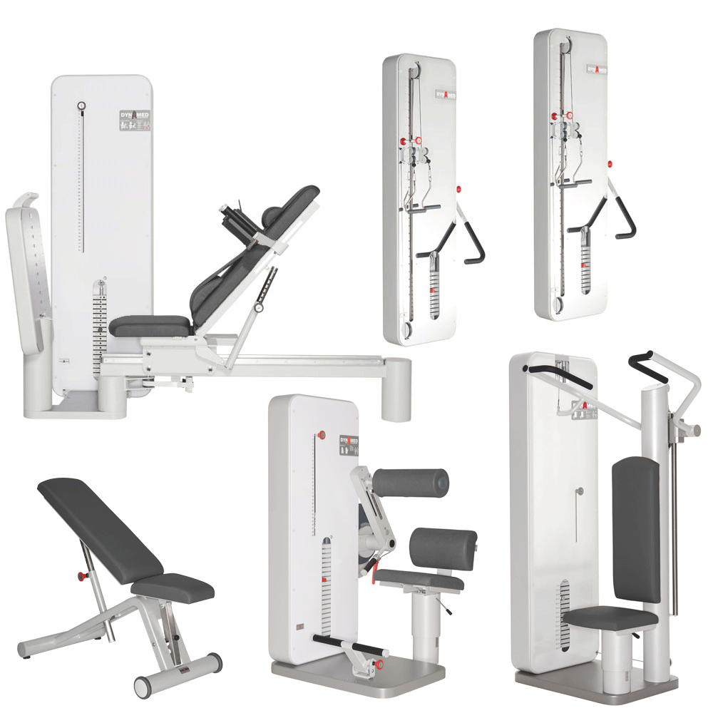 Unsere Trainingsgeräte wurden speziell für den Gesundheitsmarkt entwickelt und in Zusammenarbeit mit Physiotherapeuten konstruiert. Hierdurch genügen unsere Medizinprodukte höchsten Ansprüchen und ermöglichen die Durchführung der KGG an drei Trainingsgeräten, dem Doppelseilzug und der Trainingsbank. Grundgedanke hierbei ist, dass auf dem Angebot der KGG sukzessive oder auch direkt aufgebaut werden kann. Somit sind mit wenigen weiteren Geräten Primärprävention, T-RENA und ein eigener Selbstzahlerbereich möglich. Durch die Doppelkonzentrik der hydraulischen Trainingsgeräte können 11 Muskelgruppen bereist auf 48 m² trainiert werden.