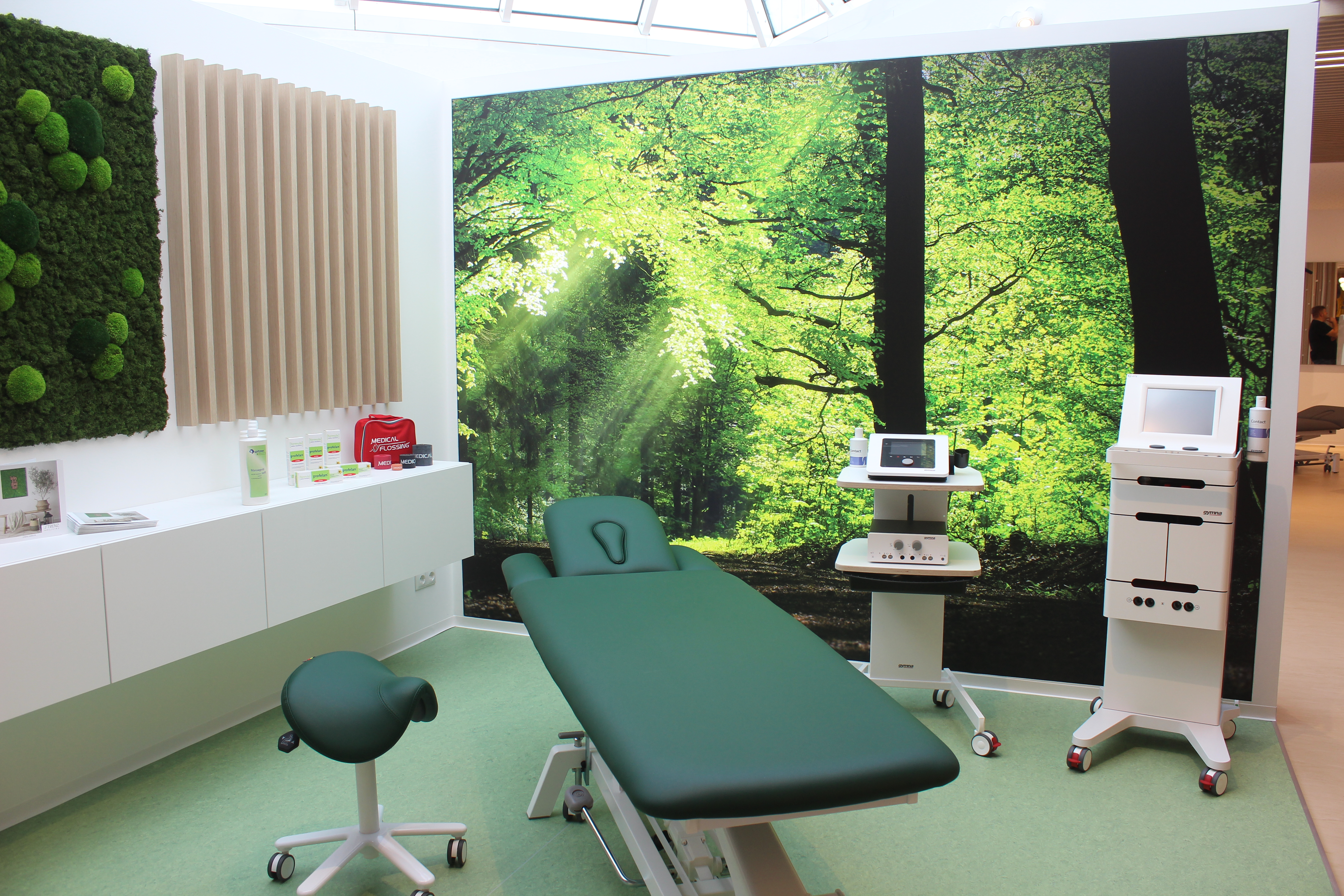 Praktischerweise lassen sich alle Themenräume per Rundgang erkunden. Neben Therapieliegen stehen hier unter anderem auch Produkte für den therapeutischen Einsatz und zur Regeneration.