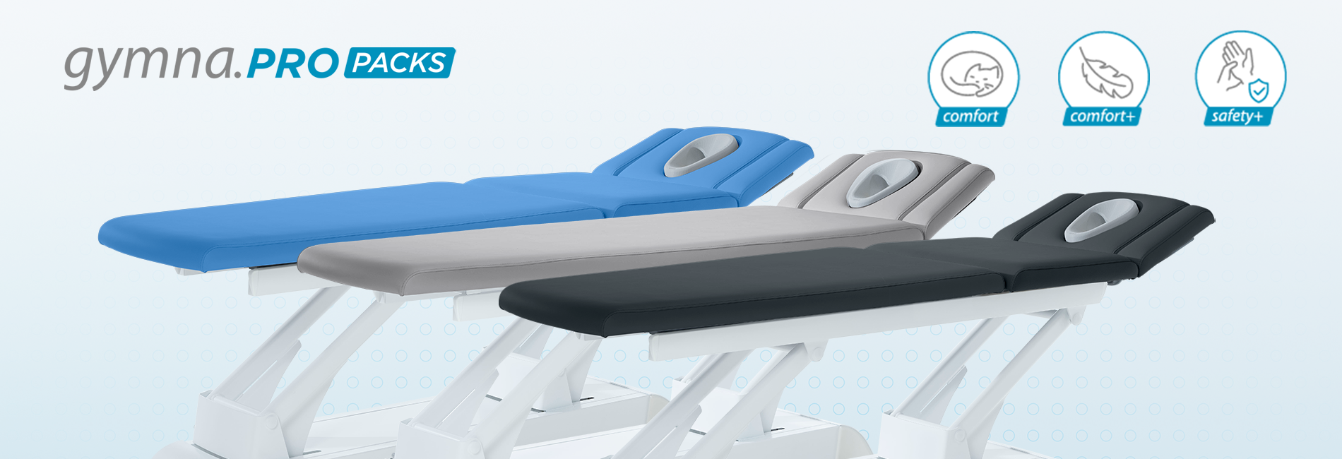 Die belgische Firma GYMNA hat auf der therapie Leipzig 2023 eine neue und einfache Möglichkeit vorgestellt, die marktführenden Liegen des Premium-Herstellers auszustatten. Die Kunden haben ab sofort die Wahl zwischen den drei Paketen „comfort“, „comfort+“ und „safety+“.