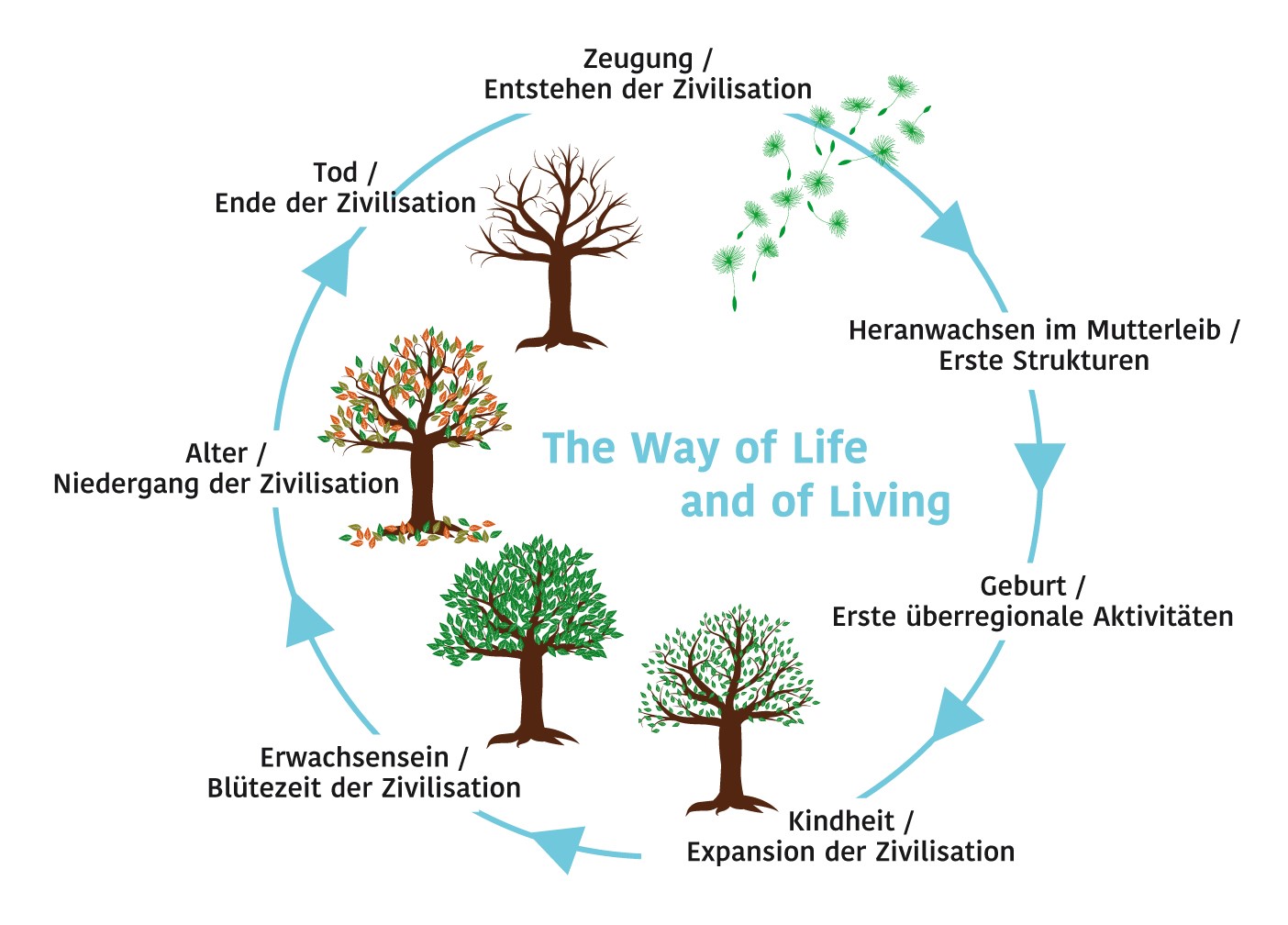 Das ist der Lauf der Dinge, the „Way of Life and of Living“. Eine Hochkultur oder Zivilisation gleicht einer Pflanze. Ein Samenkorn wird gesät, keimt zunächst in der Erde, durchdringt den harten Boden, erblickt die Sonne, blüht auf, trägt Früchte, verwelkt und stirbt letztendlich. Genau wie das menschliche Leben einer Samenzelle entspringt, aus dem Mutterleib ans Licht, ins Leben kommt, aufblüht, ggf. Früchte, eigene Kinder, trägt und letztendlich verwelkt und stirbt. Der Kreislauf des Lebens.