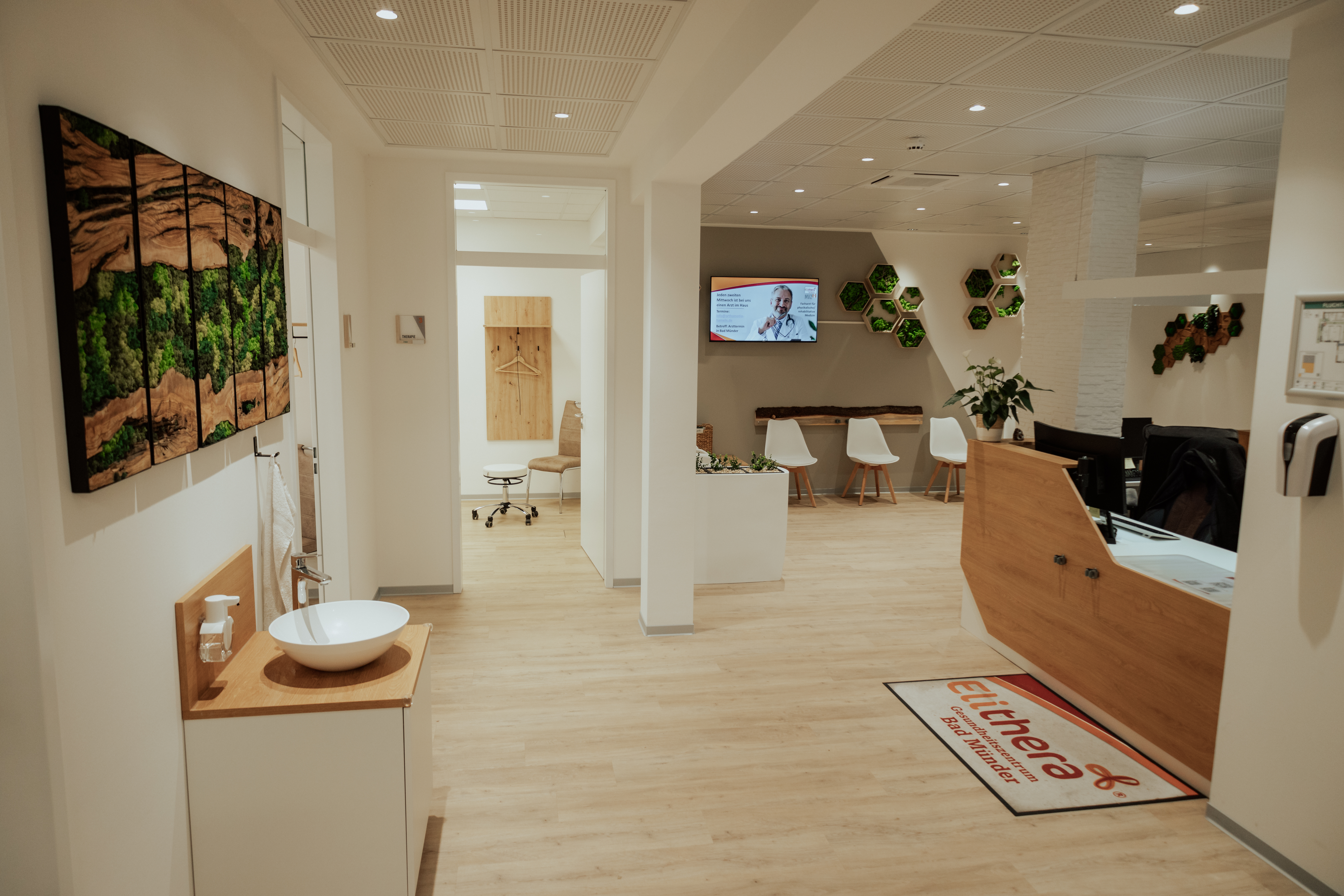 Lindner hat die Praxisgestaltung nach eigenen Ideen in Abstimmung mit Elithera umgesetzt. „Die geplante Praxiseinrichtung passte zum Corporate Design von Elithera, weshalb mir bei der Auswahl der Möbel und Gerätschaften freie Auswahl gelassen wurde“, erinnert sich der Inhaber. Insgesamt dauerte der Umbaunach der Vertragsunterschrift im Dezember 2022 sechs Monate, Lindner packte an vielen Stellen selbst mit an.