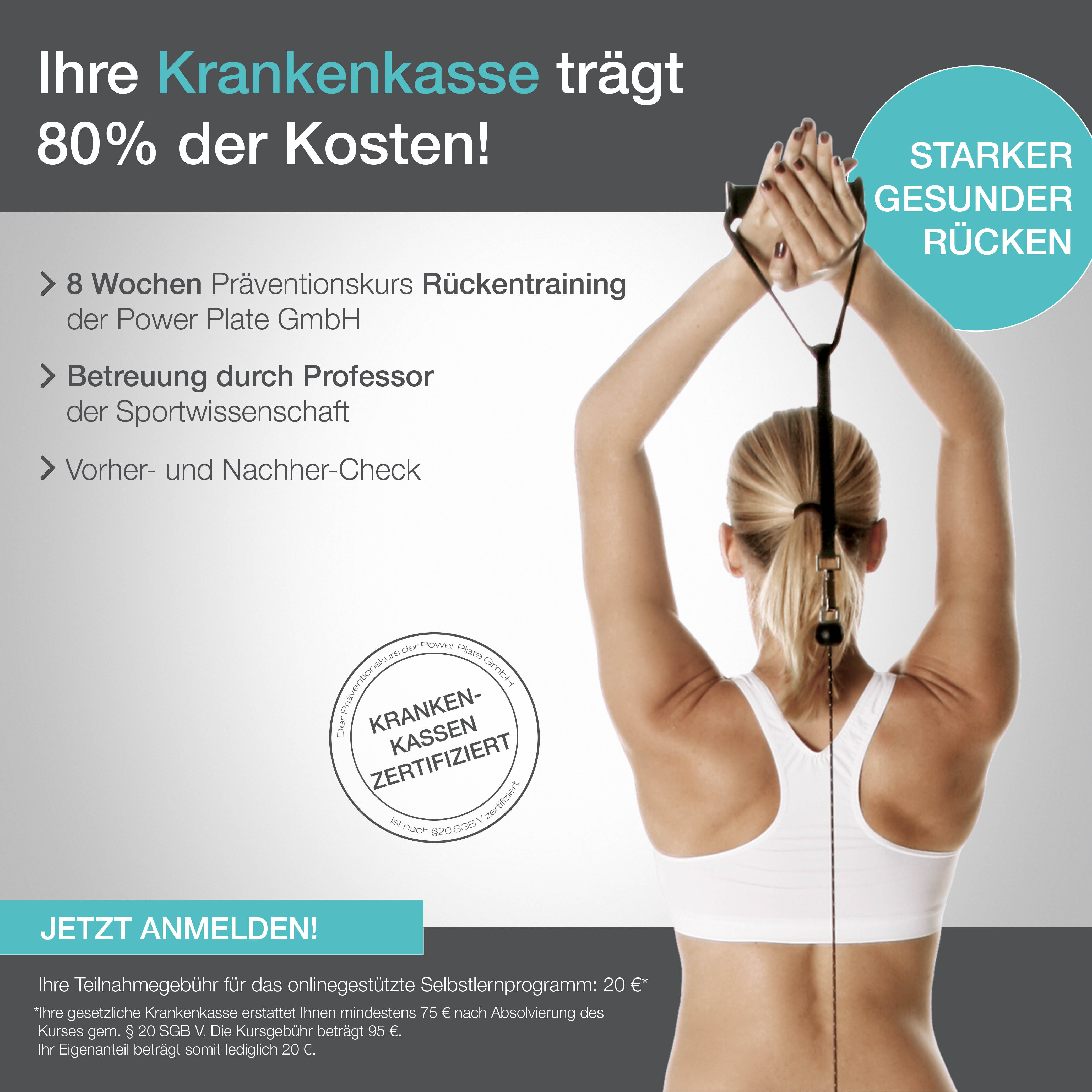 Von der Prüfstelle für Prävention erfüllt dieser Rückenkurs alle Qualitätskriterien. Ohne Personalaufwand für das Studio und Einnahmen in Höhe von 95 € pro Teilnehmer. Mindestens 80% aller Kosten tragen die Krankenkassen, teilweise bis zu 100%. Das onlinegestützte Selbstlernprogramm hat eine Dauer von 8 Wochen. Der Präventionskurs ist für jeden zugänglich und so konzipiert, dass man direkt bei einem Power Plate Anbieter starten kann. Durch die E-Mail-Erinnerungsfunktion verpasst man keine Einheit und erhält alle Handbücher automatisch.- Power Plate GmbH