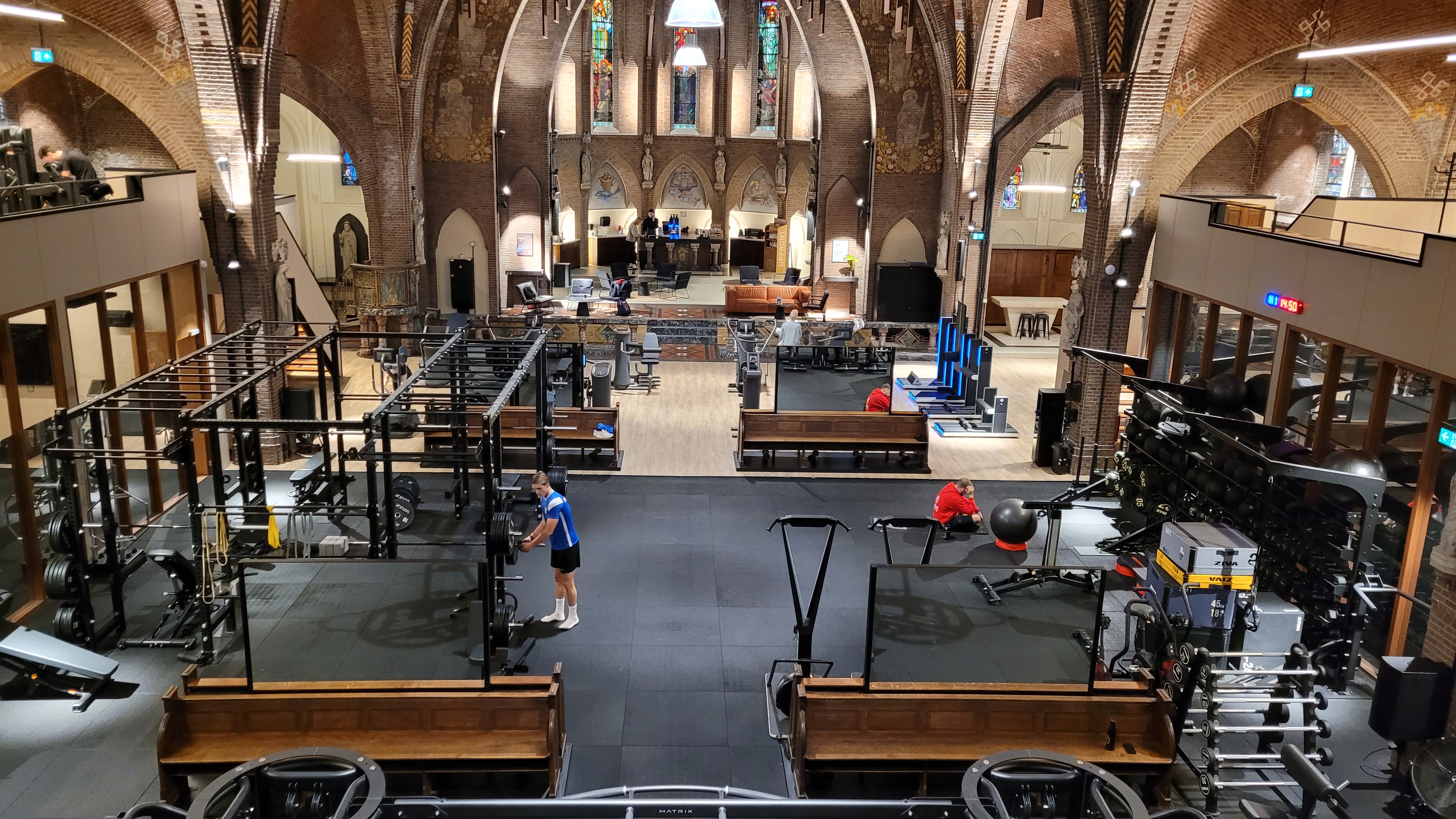 Gründer Arjan hat sich bei seinem dritten Standort (nach 2015 und 2019) bewusst für einen Mix aus vorhandenen Strukturen und neuen Gym-Elementen entschieden. Der frühere Altar bietet nun Platz für einen Empfangsbereich mit Getränken und gemütlichen Sitzen. Im Mittelbereich befindet sich eine großzügige Kraftfläche rund um die noch erhaltenen Kirchenbänke, ausgestattet mit EGYM, einem funktionellen Bereich und Flexx-Geräten.