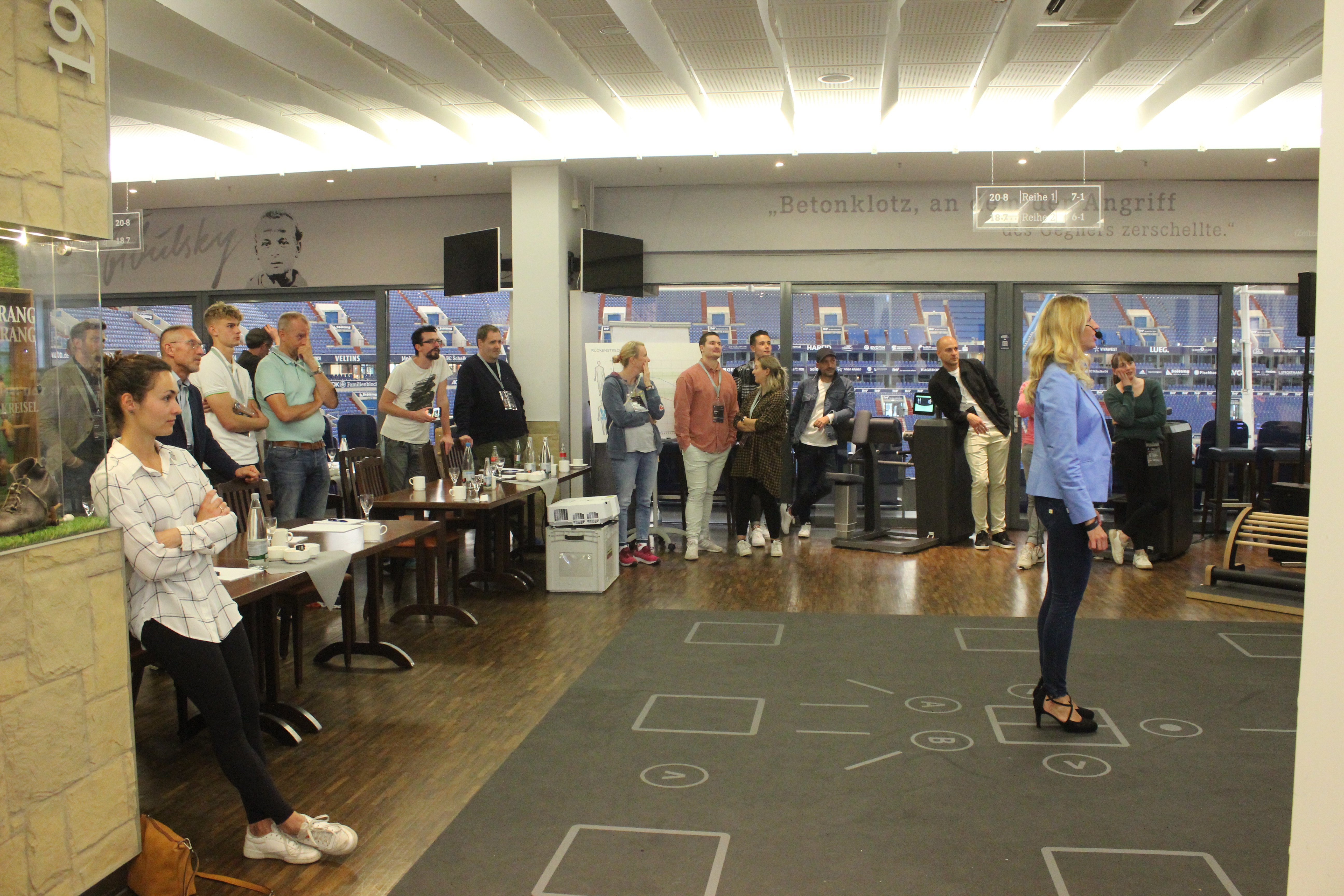 Einen recht neuen Ansatz stellte Christin Görlach vor. Der Skillcourt ermöglicht Vikomotorisches Training, also die Verbindung von visuellen, kognitiven und motorischen Funktionen. Garniert wurde das Event dann noch durch eine interessante und kurzweilige Stadionführung sowie eine Stadionwurst. Insgesamt freute sich die milongroup über etwa 400 Besucher (davon 1/3 Physios) bei den fünf Events in Hamburg, Berlin, Frankfurt, Gelsenkirchen und München.
