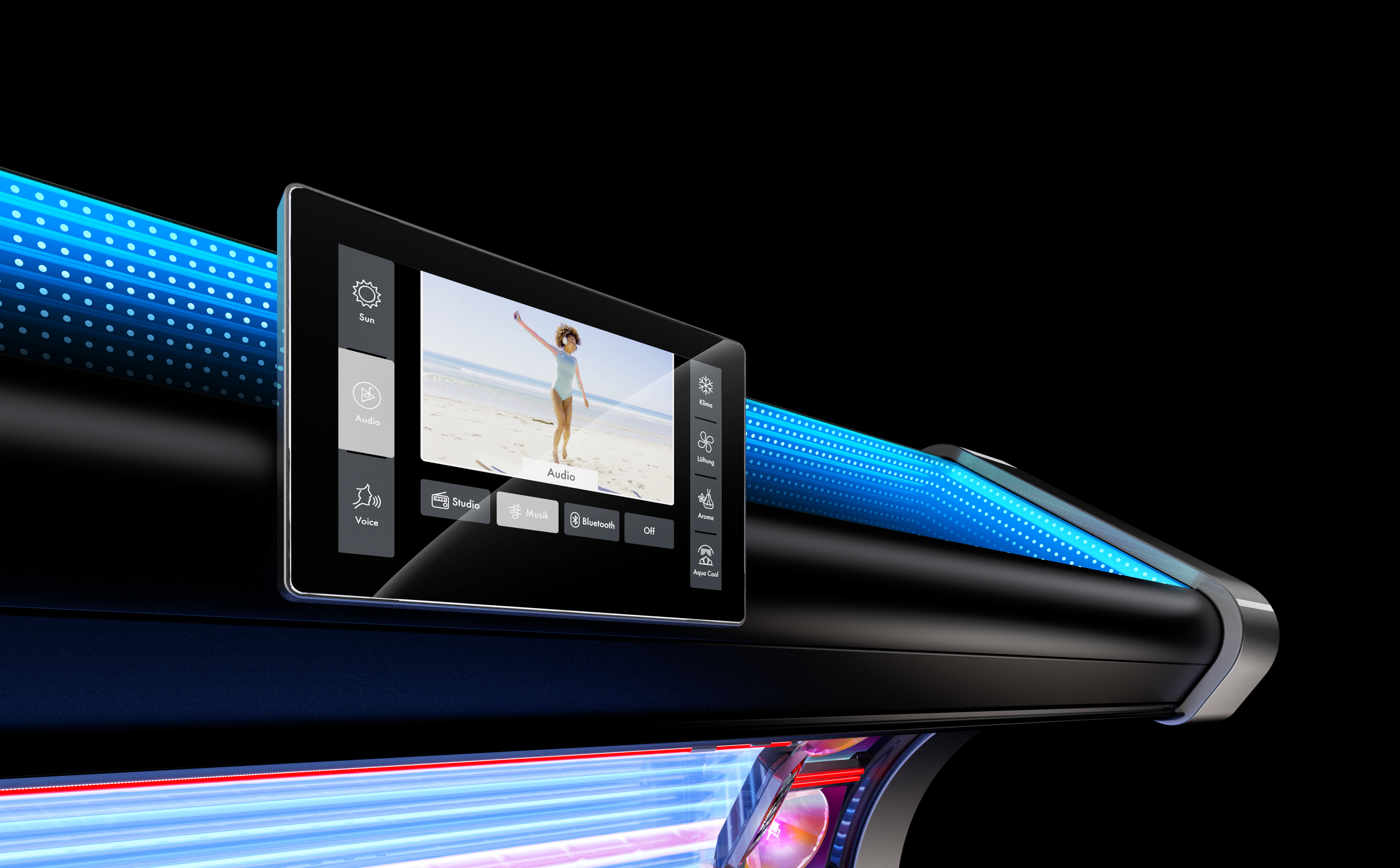 Video-Clips stellen das neue Modell vor und weisen auf individuell einstellbare Komfortmerkmale hin. Schon vor der Besonnung können über das intuitive Touch-Display persönliche Vorlieben ausgewählt werden. Betreiber haben einen einfachen Zugang zu allen wichtigen Wartungsund Serviceeinstellungen. Natürlich können Solarien-Betreiber auch individualisierte Video-Clips mit Werbe-Botschaften einspielen und damit Zusatzeinnahmen generieren.