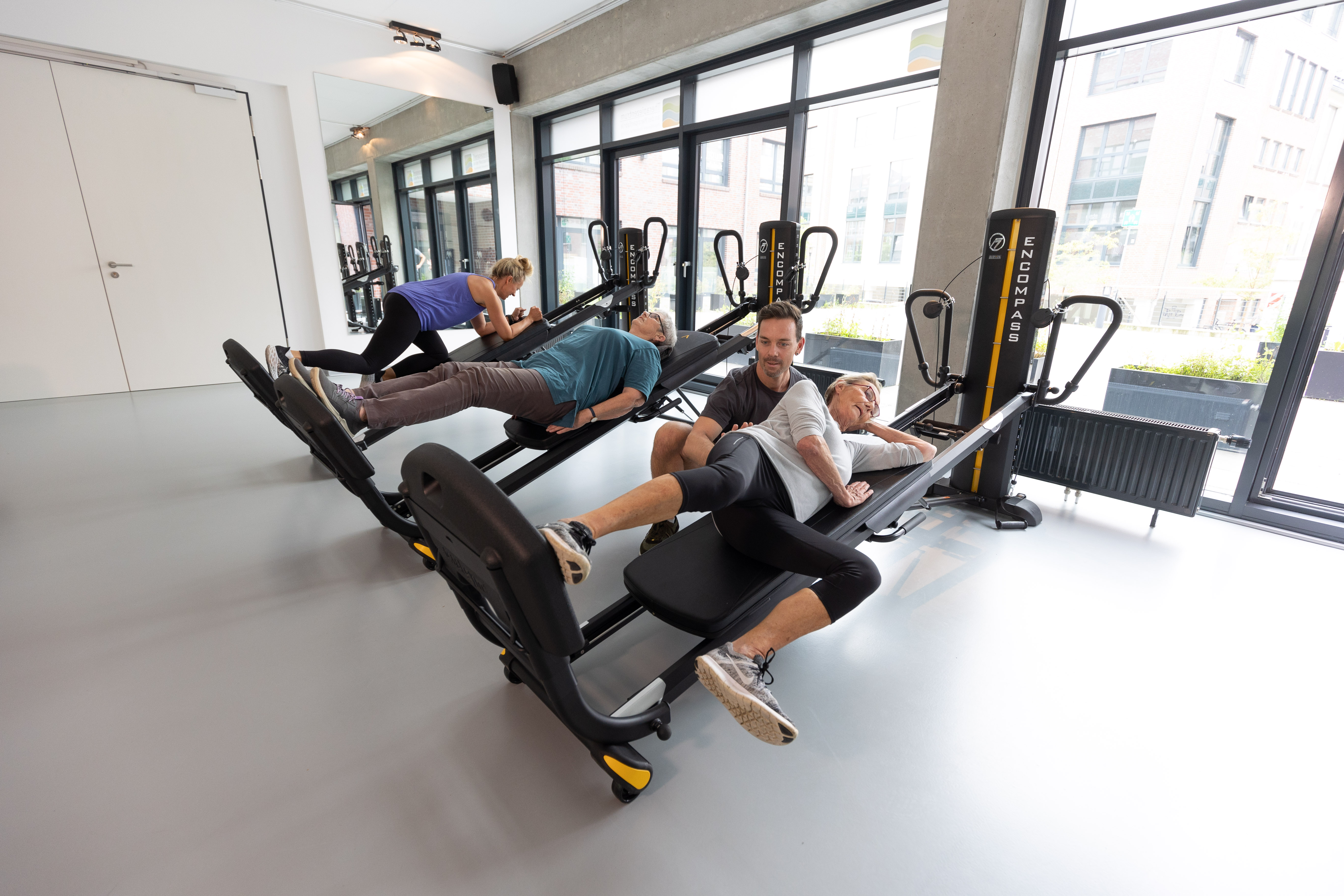 Unsere Trainingsgeräte wurden speziell für den Gesundheitsmarkt entwickelt und in Zusammenarbeit mit Physiotherapeuten konstruiert. Hierdurch genügen unsere Medizinprodukte höchsten Ansprüchen und ermöglichen die Durchführung der KGG an drei Trainingsgeräten, dem Doppelseilzug und der Trainingsbank. Grundgedanke hierbei ist, dass auf dem Angebot der KGG sukzessive oder auch direkt aufgebaut werden kann. Somit sind mit wenigen weiteren Geräten Primärprävention, T-RENA und ein eigener Selbstzahlerbereich möglich. Durch die Doppelkonzentrik der hydraulischen Trainingsgeräte können 11 Muskelgruppen bereist auf 48 m² trainiert werden.