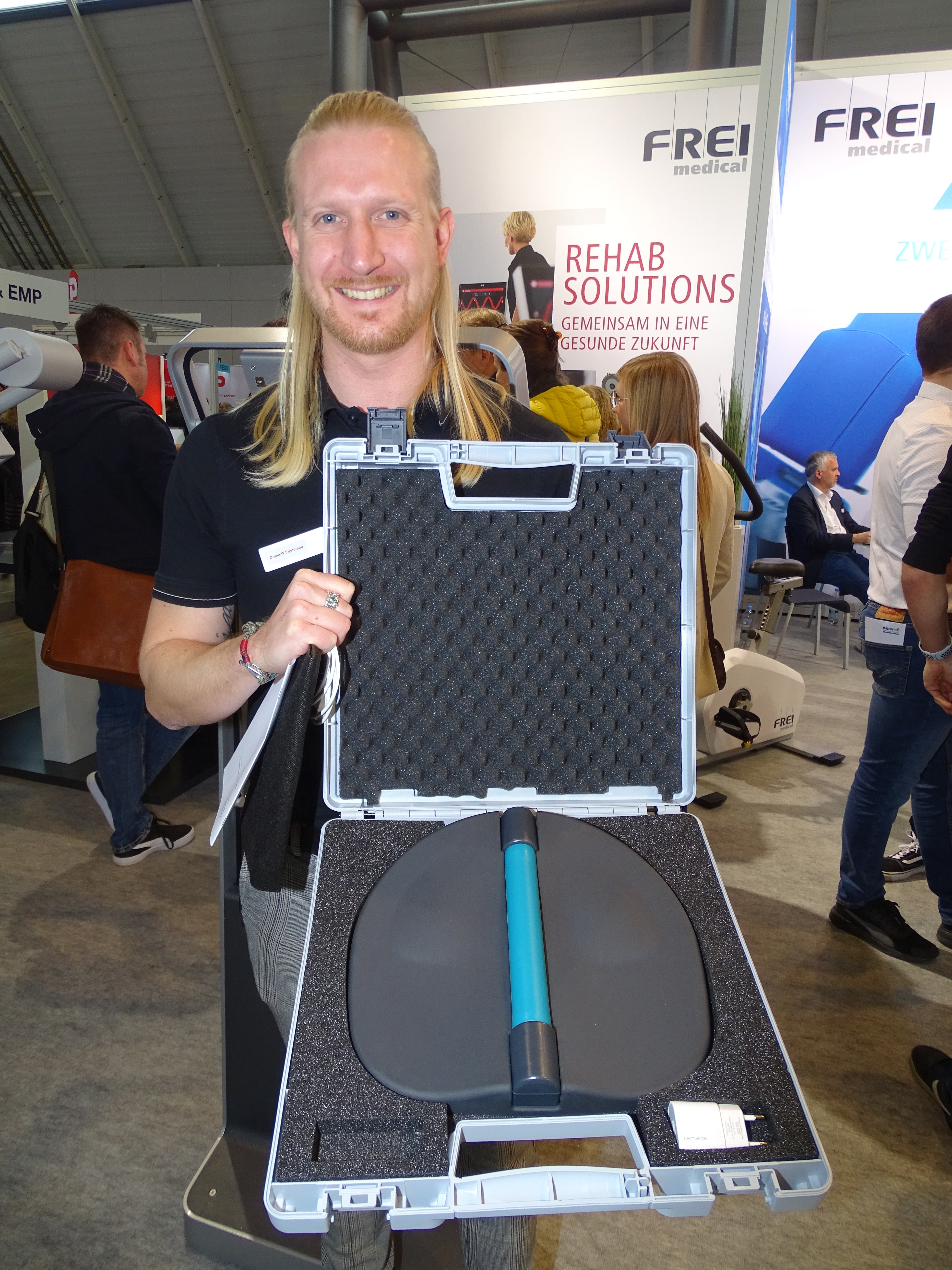 Auf ein Beckenbodentraining mit dem Smartphone setzt der mobile Beckenbodentrainer der FREI AG. „Über eine App auf dem Smartphone ist ganz deutlich ein Biofeedback sehen, ob man den Beckenboden richtig anspannt, und vor allem entspannt“, so Dominik Egetemeir, Leitung Vertrieb Deutschland. Der Vorteil des 2019 auf der Medica vorgestellten mobilen Beckenbodentrainers liegt darin, dass Therapeuten ihn zu Hausbesuchen mitnehmen können. Er kann auch von Betroffenen ausgeliehen werden, sodass sie ohne Intimkontakt Zuhause ihren Beckenboden trainieren können.