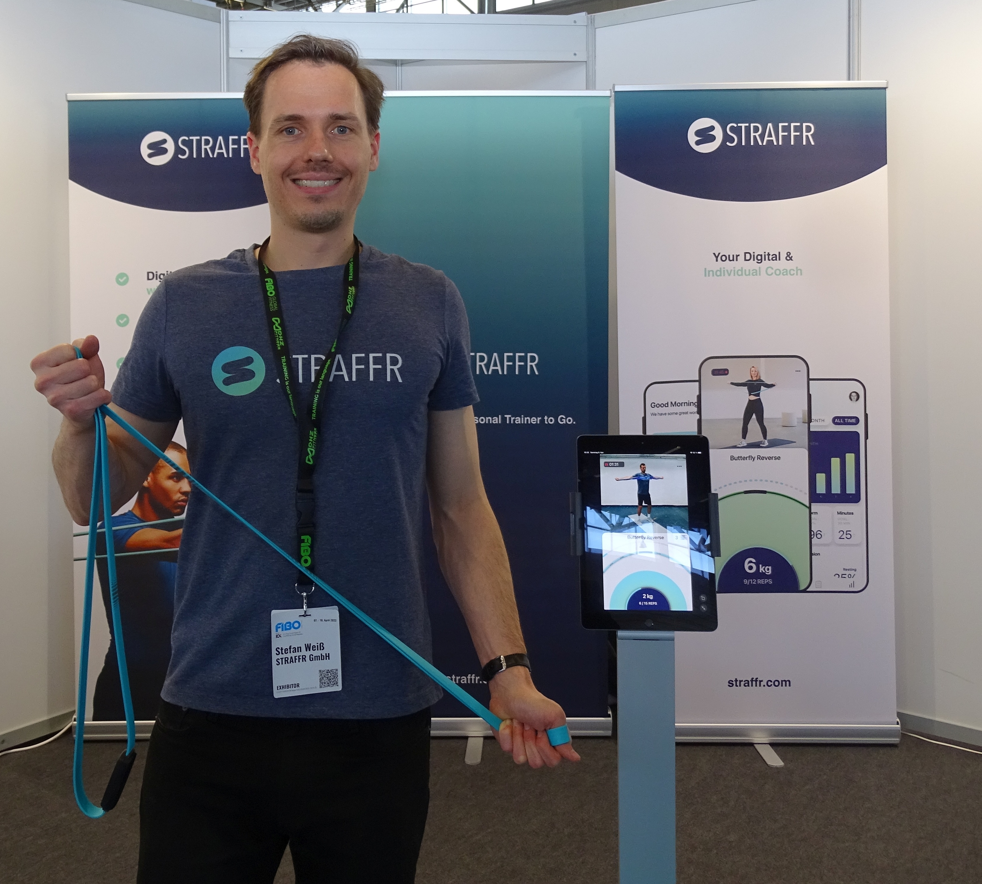 Gleich daneben stand Stefan Weiß von Straffer GmbH. Der CEO und CoGründer zeigte sich von den vielen Direktverkäufen auf der Messe begeistert. Straffer ist ein Fitnessband, das im Unterschied zu herkömmlichen Bändern die Kraft, die Wiederholungsanzahl und die Geschwindigkeit während der Übung misst. Über eine App gibt es ein direktes Feedback.