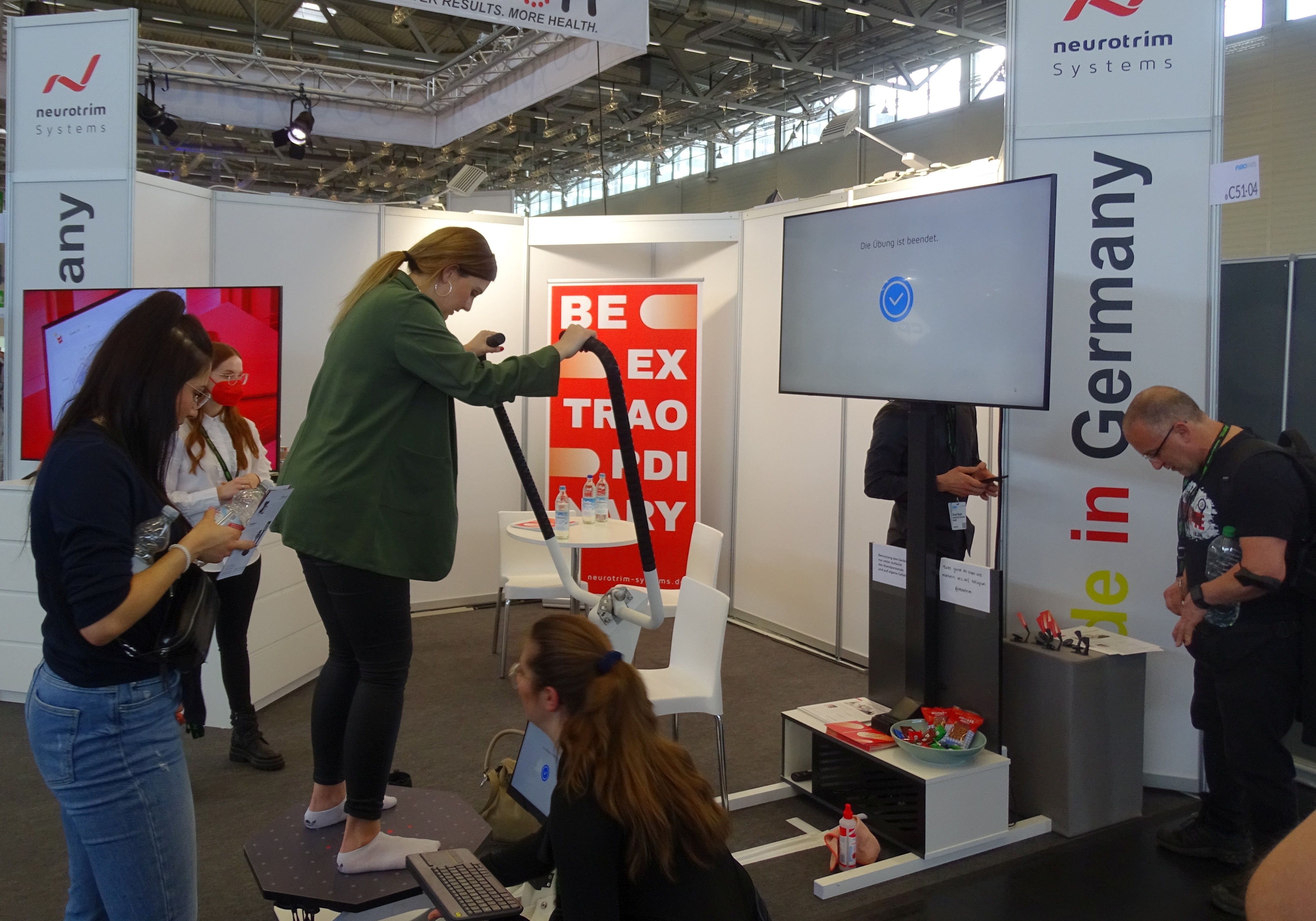 Made in Germany – so nannte sich der Bereich von Sportable und Straffer. Hier stellten auch neurotrim und Cureosity aus. Cureosity hat neurogenerative Erkrankungen im Blick und arbeitet mit VR-Brillen. neurotrim widmet sich der sogenannten NeuroFitness und zielt darauf, Balance, Koordination, Propriozeption und Muskeln zu trainieren.