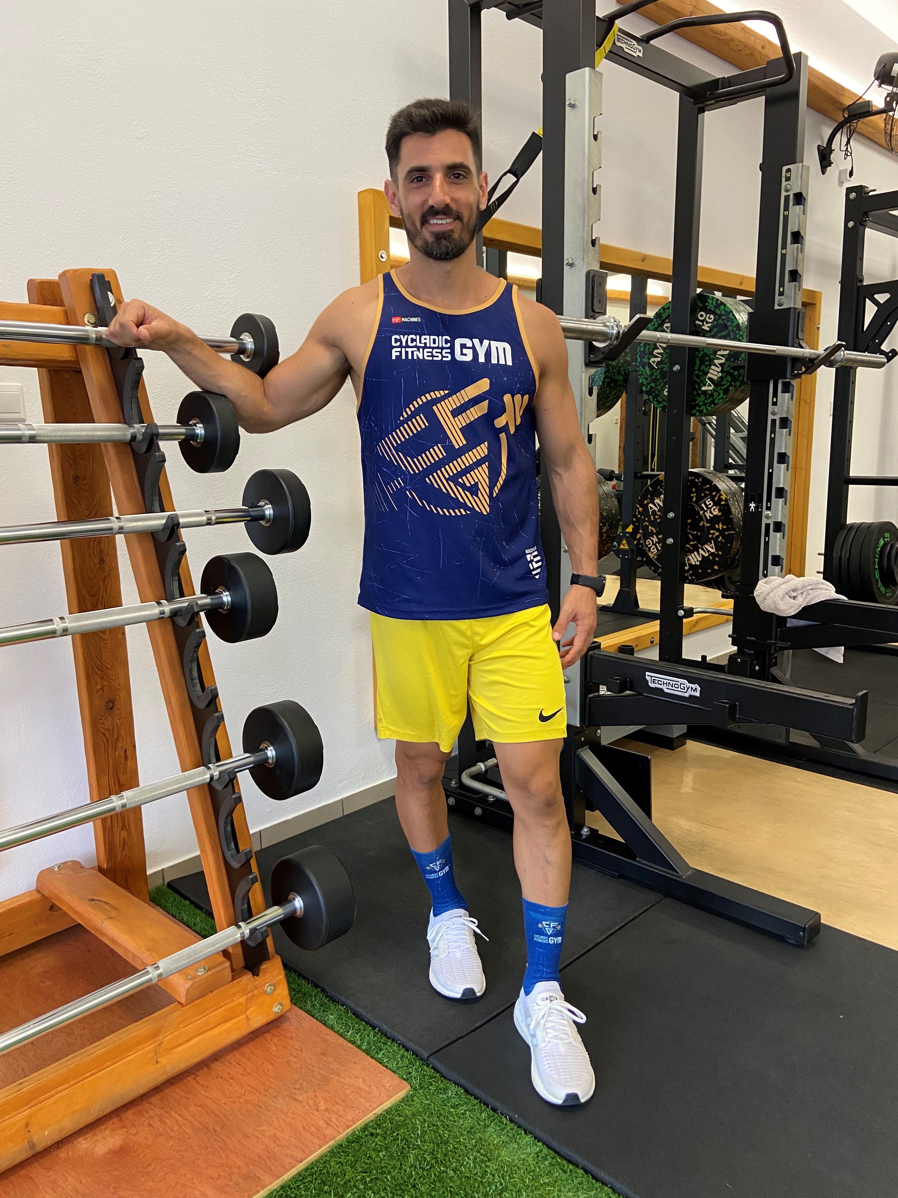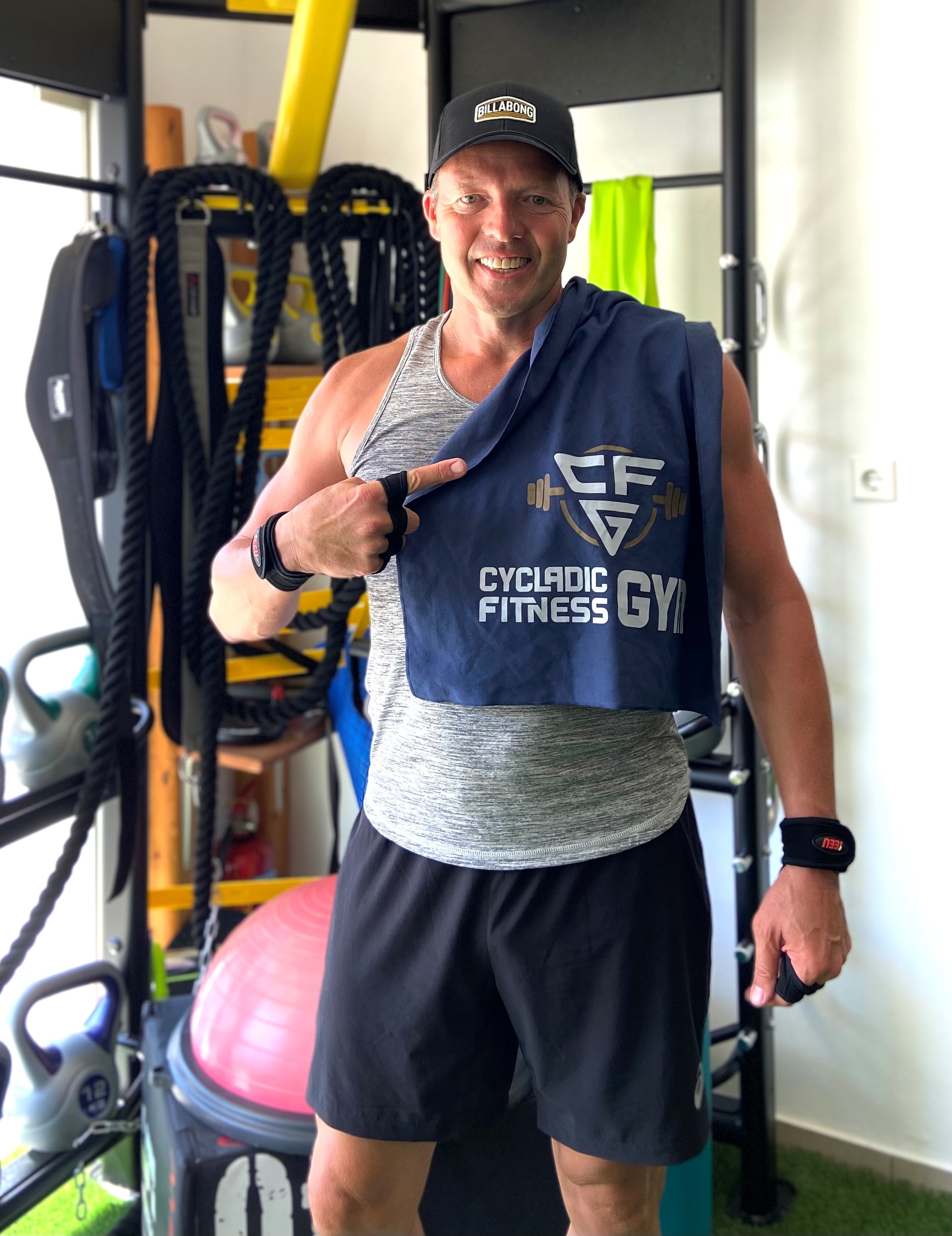 Also habe ich mich vor Ort direkt auf die Suche begeben nach einem geeigneten Studio und fand zwanzig Minuten von unserem Appartement entfernt das Cycladic Fitness Gym (CFG) von Manolis Mandilaras. Er ist Sportwissenschaftler, Athletik- und Rehatrainer und hat an der Uni in Athen studiert. Mandilaras ist auf Naxos geboren und mit zwei kleinen Kindern auch familiär fest verbunden mit der Insel.