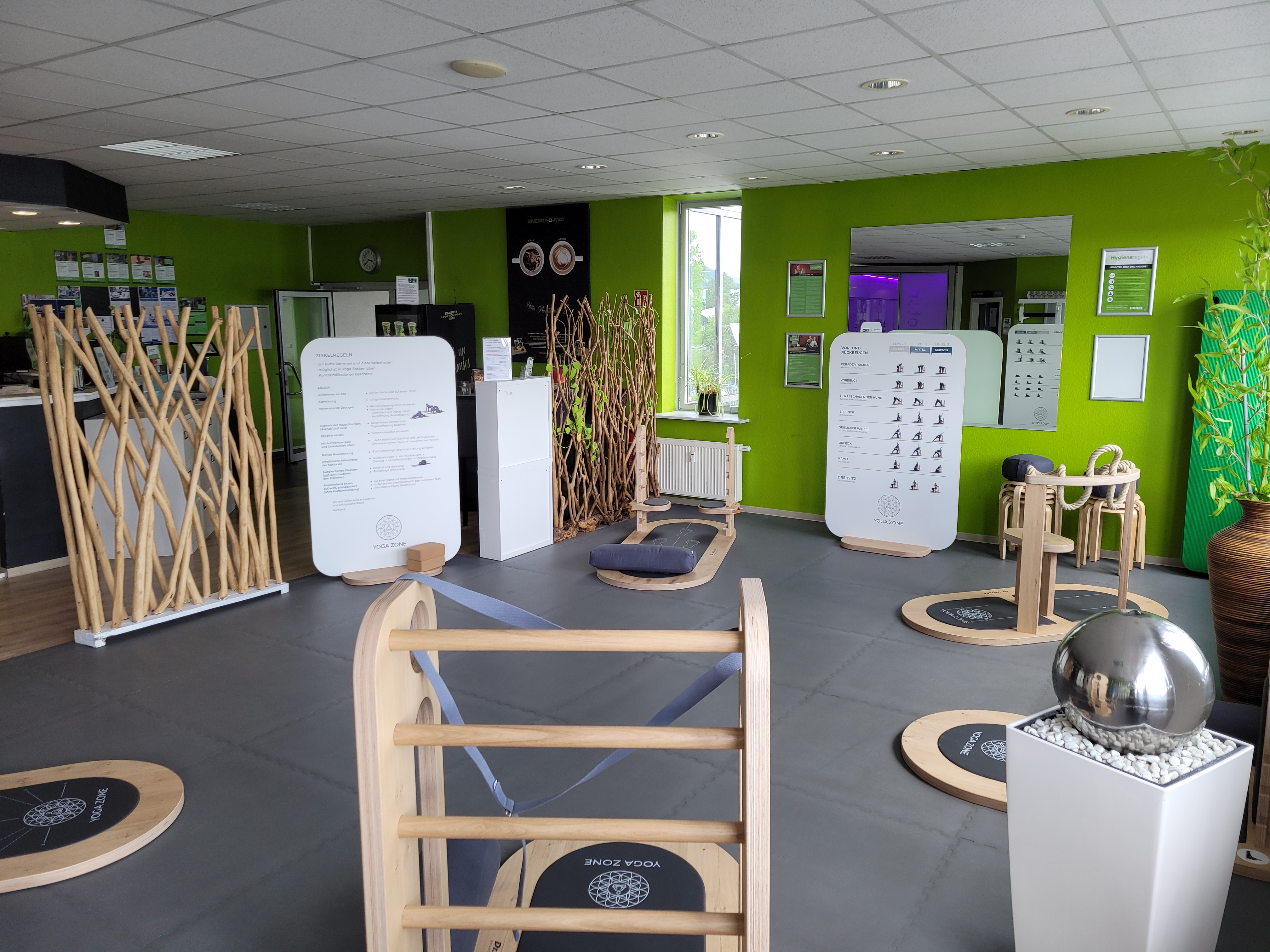 Das Konzept besteht aus fünf Modulen, die jeweils mehrere Yoga-Übungen ermöglichen und mit erklärenden Tafeln ausgestattet sind. Auch optisch ist der Zirkel auf relativ kleinem Raum in Verbindung mit weiteren Elementen wie Raumteilern und Pflanzen ein echter Hingucker und passt sich gut in das Ambiente ein.